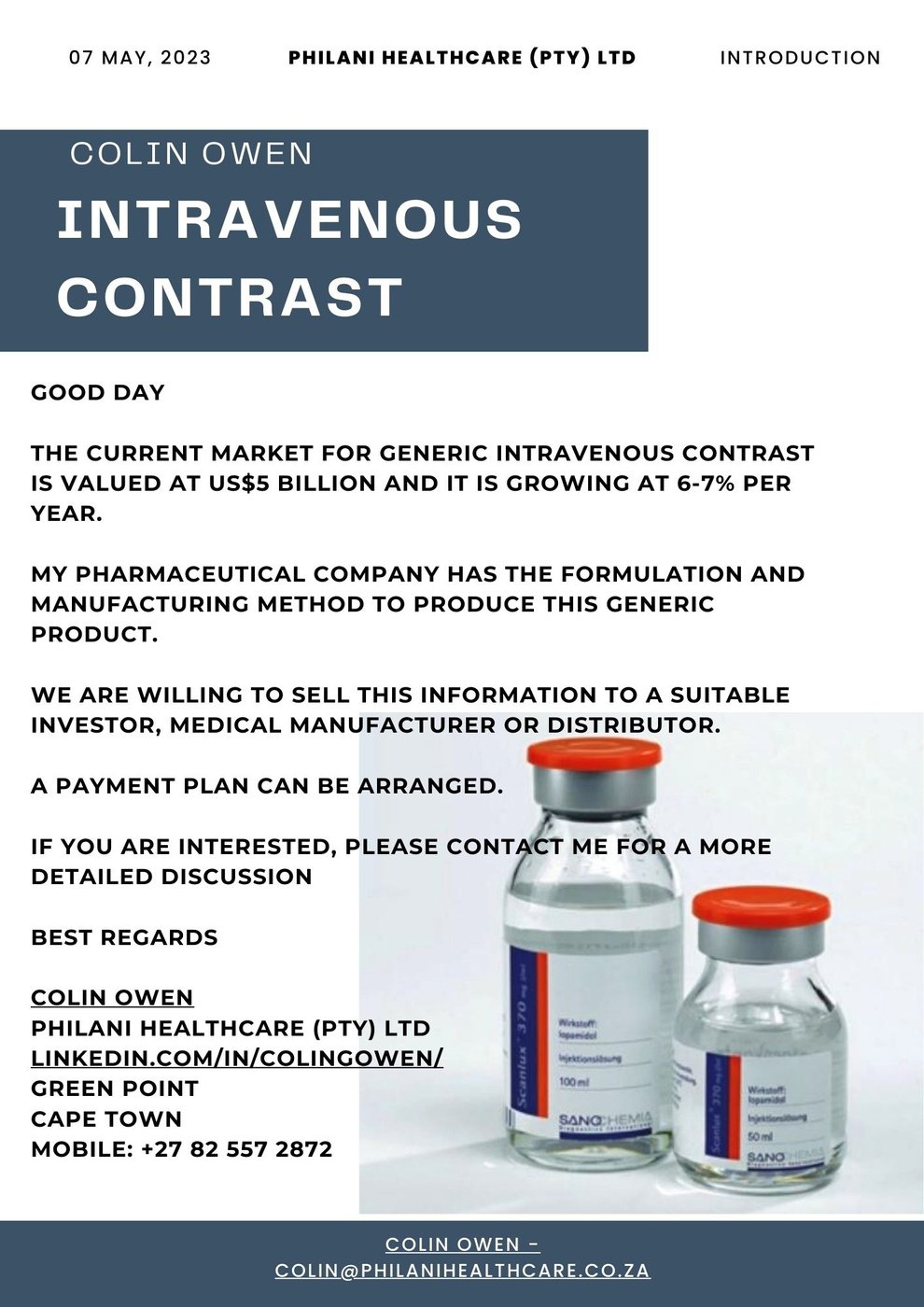 Currently looking for a new investor for intravenous contrast product.